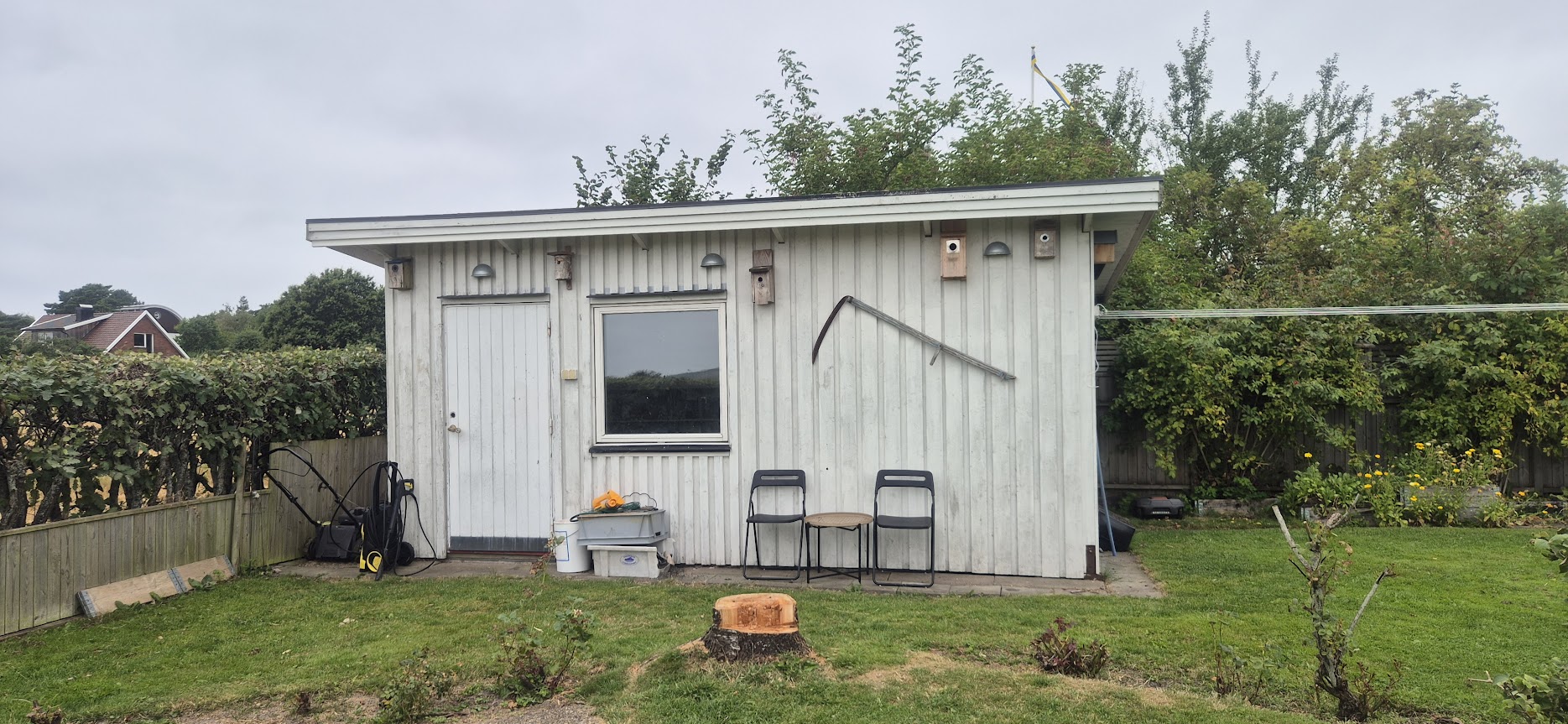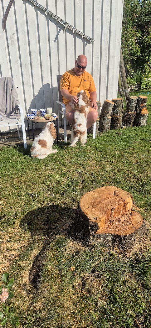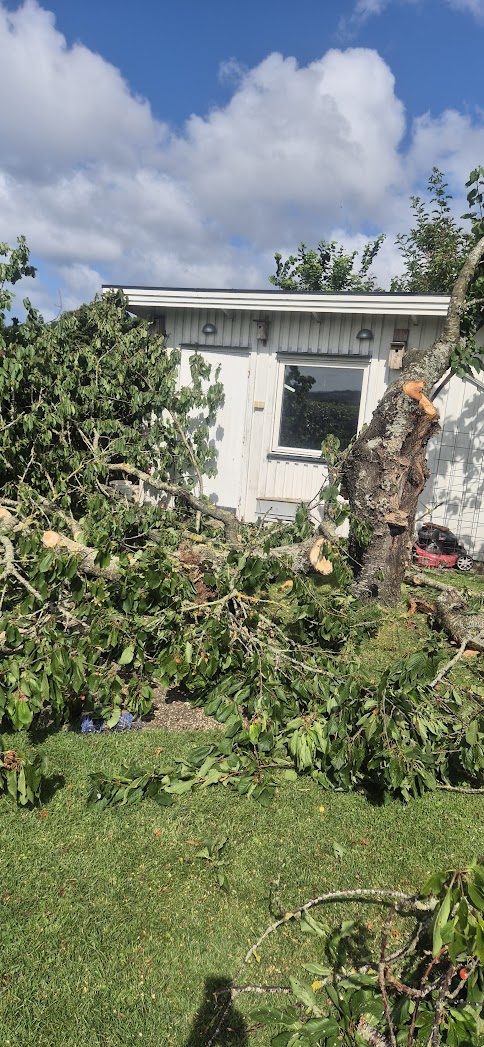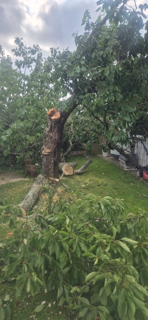 Vi har haft fullt upp i vår trädgård, tagit ner en nästan 60 år gammalt körsbärsträd. Visst var körsbären goda men det var bara fåglarna som kunde njuta av det samt getingar o bin som frossade i bären på gräsmattan. Så gå barfota var ingen bra idé. Nu är trädet borta, vår trädgård ser ljus och stor ut. Men kvar är roten, det blir nog lite komplicerat ta bort den. Men allt går att lösa.