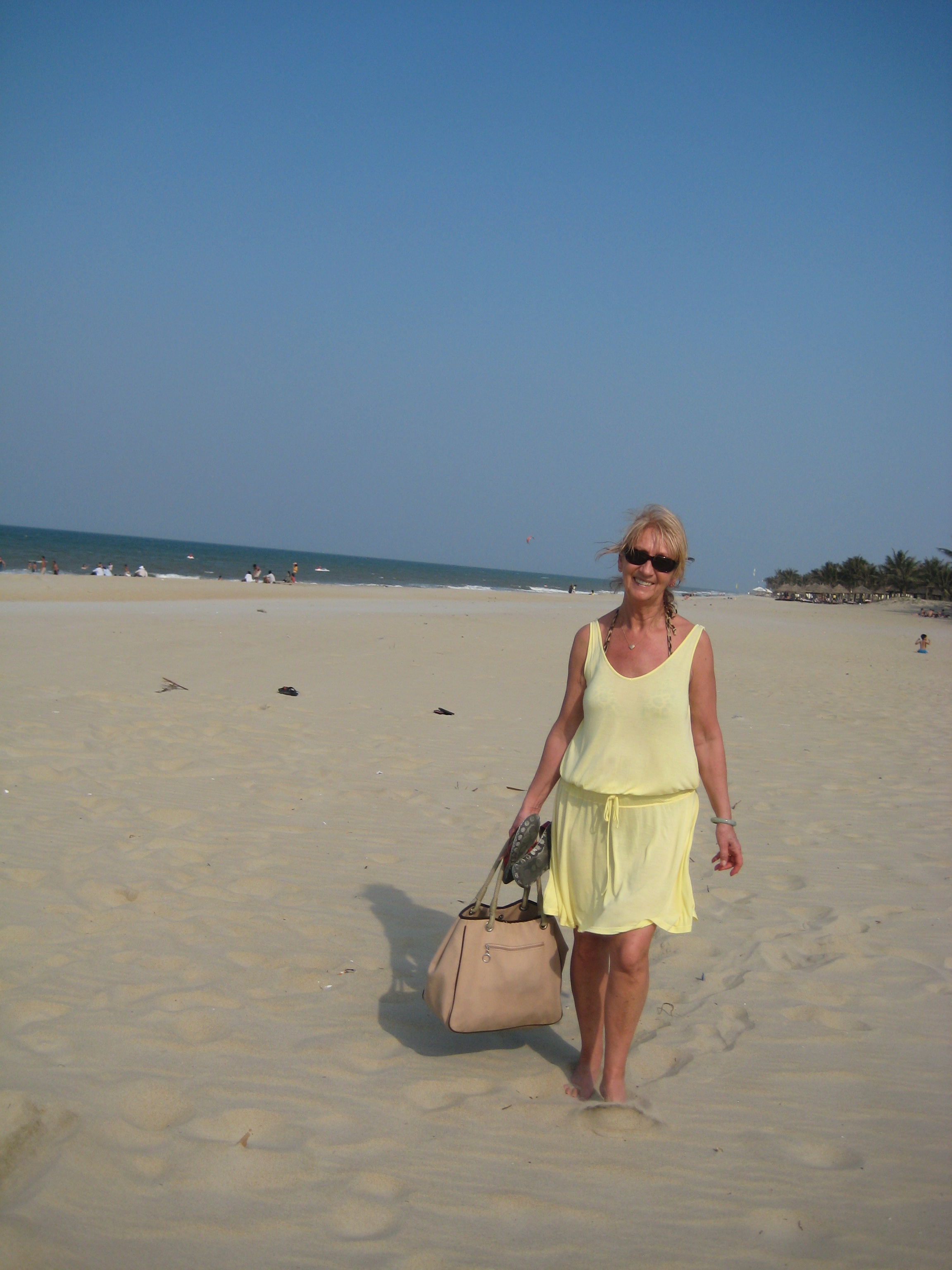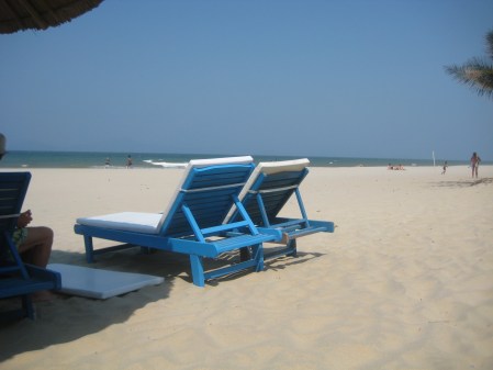 I år besökte jag Hoi An. En mindre stad, berömd för sin Japanska Bro och gamla stad, men också för sin fantastiska strand. Stranden går ända upp till Danang, flera mil lång. Än så länge är det inte bebyggt med stora hotell eller flotta restauranger. Det är ett vimmel av småbutiker och matställen. De flesta har fantastisk god mat. Ett förträffligt matställe Chinh, till höger om brofästet på väg från stranden. När jag var där blåste det oftast på eftermiddagarna, härliga vågor, de drar upp lite sand. Det finns solstolar att hyra. Gott om försäljare som gärna pratar bort en stund. Man kan välja att bo centralt i stan några kilometer från stranden. En del   hotell har gratis  transport till stranden och man kan låna en cykel om manvill. Väljer man att bo vid stranden istället har hotellen gratis transport till centrum och man kan även låna en cykel. Här är det säsong september – april. temperaturen ligger oftast rund +28 gr. Under sommarmånaderna kan det bli för varmt. Blåsten avtar under sommaren.
