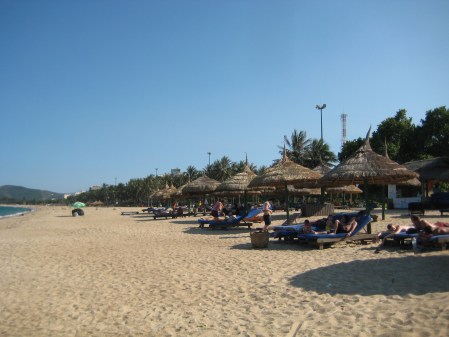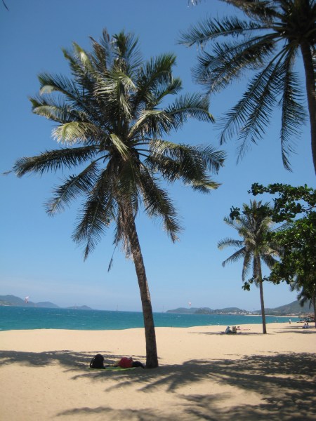 Nha Trang, första känslan var Franska Rivieran. Men så var det alltså inte. Här kantas stranden av en park med palmer och en bred boulevard. På andra sidan boulevarden ligger hotell, restauranger och affärer. Stranden är härligt vit, blått hav, öar som man kan åka ut till, dyka om man vill. På stranden finns solstolar att hyra. Det går linbana ut till en ö med akvarium.  Jag tyckte personligen väldig bra om Nha Trang. Även här är säsongen som i Hoi An.