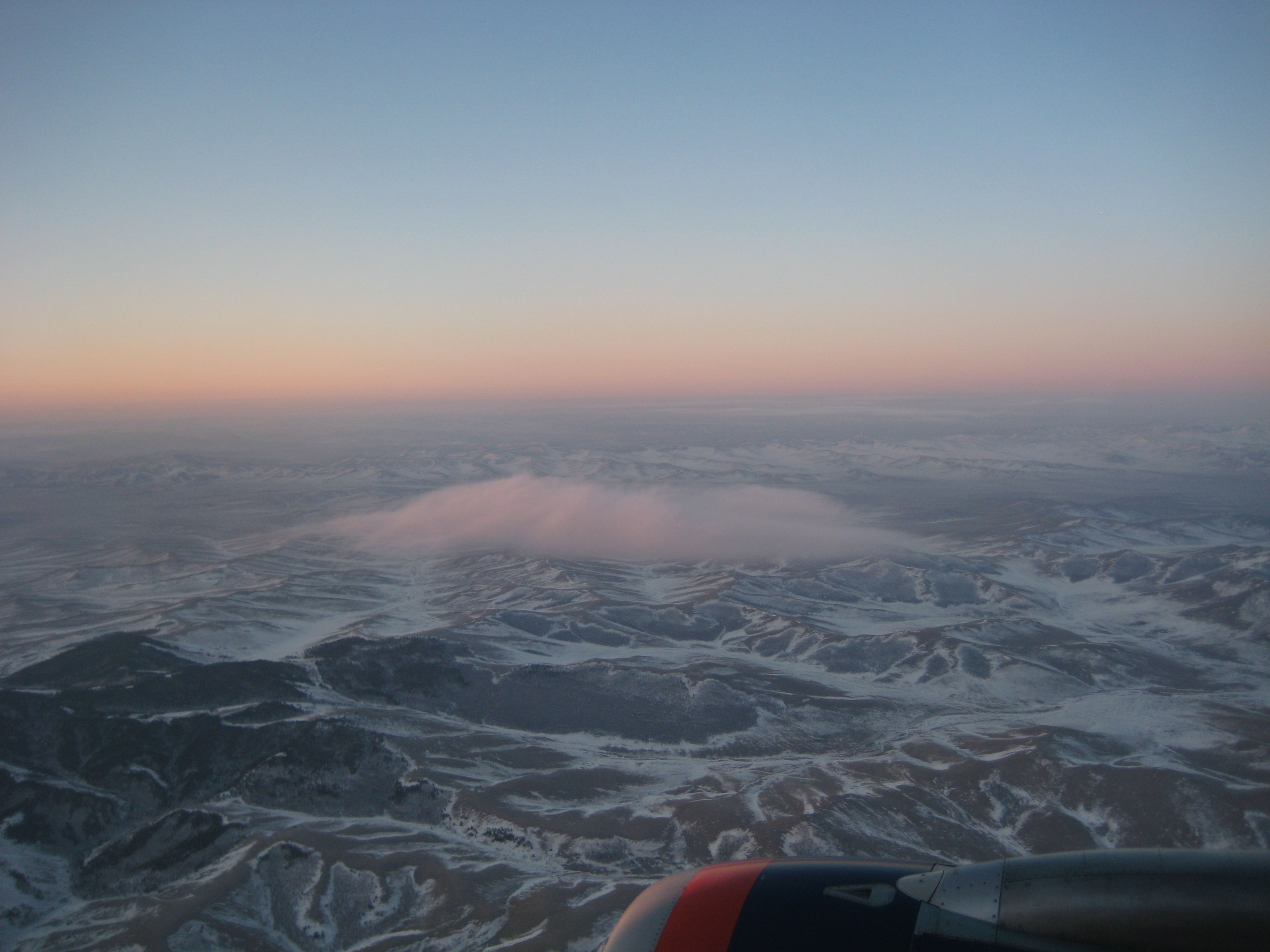 Inflygningen till Mongoliet var häpnadsväckande vacker. Det började ljusna under oss låg fantastiska bergskammar täckta med snö. Solen stiger i öster och färgar bergen i mjuka solvarma färger.