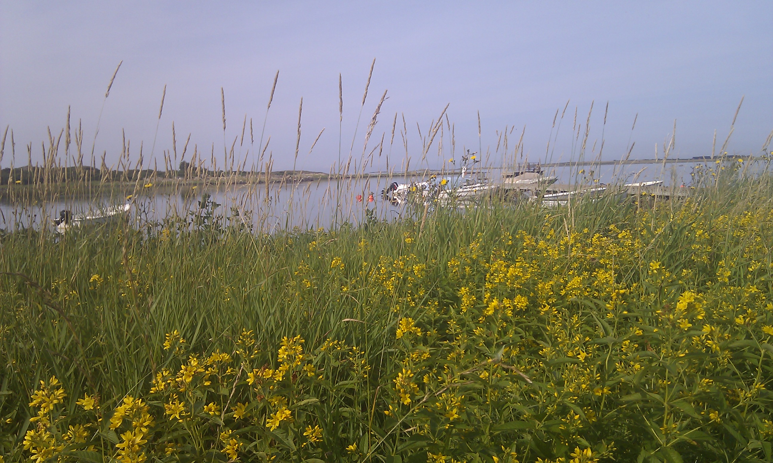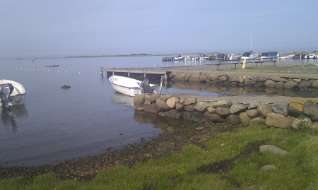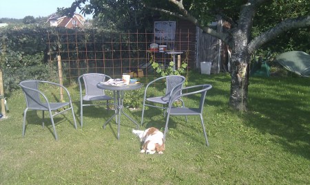 Varje morgon om vädret tillåter äter James Bond och jag vår frukost under körsbärsträdet intill dammen. Givetvis ger vi fiskarna mat också. Det är så fridfullt sitta under trädet och äta, läsa tidningen, kolla fiskarna. För mig är det livskvalité. Efter frukosten tar vi, dvs James och jag en lugn promenad, med tanke på att han har blåsljud på hjärtat nu och dessutom inte är så bra i ryggen. Ibland blir det en kort promenad knappt 1 kilometer, innan James visar att han vill hem. Ibland som idag blir det ner runt Balgö Brygga, James får svalka sig i havet. Sedan är det dags att gå hem och sätta sig att arbete, vilket är väldigt stimulerande.