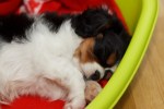 I natt satte jag mig bredvid henne när hon la sig i valplådan. Efter en stund låg hon på golvet. Jag tyckte det var lite kylig och tog en fleecepläd och lade mig på. Då kröp hon och lade sig intill mig. Så vi låg där på golvet utan madrass (hårt) Stella lade sig på golvet ibland kom tillbaka och låg på pläden. Lång natt. Och inte blev det nåt heller, trots att hon ibland flåsade och sträckte sig väldeliga.