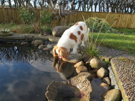 Hälsar på guldfiskarna och passar på dricka vatten