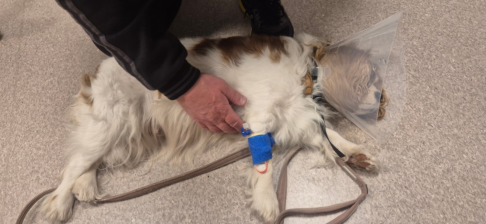 Vi fick akut köra kl 22 på natten till Blå Stjärnan i Göteborg, numera finns den i Mölndal. Hon fick kateter satta, var trött och somnade. Det blev röntgen och konstaterat att hon måste opereras. Vi var hemma igen 04.30. På förmiddagen ringer personalen och berättar att natten varit okej, lite illamående av medicin, operation efter kl 13 på påskdagen. Senare vid 17-tiden ringer veterinär Gustaf Svensson (den veterinär som 2009 opererade vår James Bond, då taket på hans ryggrad/kotorna hade sjunkit in och lagt nerverna i kläm, en stor ryggoperation. Lyckad operation) Han berättar att Stacy nu är opererad och allt gått bra, hon skall få komma hem på Annandag påsk. Tack och lov!