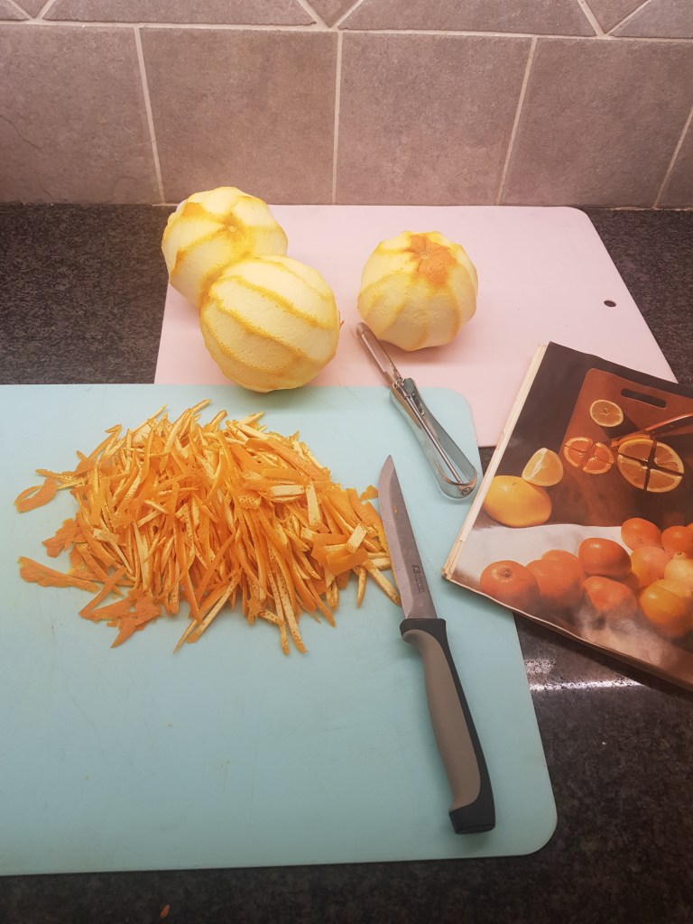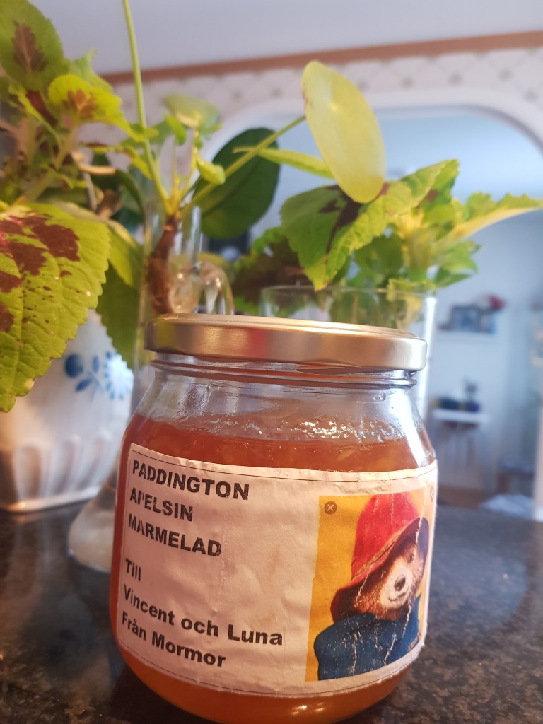 En innesittardag, men sitta och sitta!? Nja, jag började göra marmelad. För ett år sedan såg barnbarnet, då snart 5 år och jag på två filmer om Paddington. I 2:a gör han, Paddington apelsinmarmelad när han är i fängelset. Vi blev så sugna på marmelad att jag genast satte igång med att göra marmelad. Alltså jag blev nästan kär i denna söta lilla björn från Afrika. Vilken fin film det var. Sagt och gjort marmeladen blev väldigt god. Så varför inte göra marmelad i år med. Full fart i köket! Blev god marmelad, men lite lös tyckte kanske jag, så nu blir det en sats marmelad till.