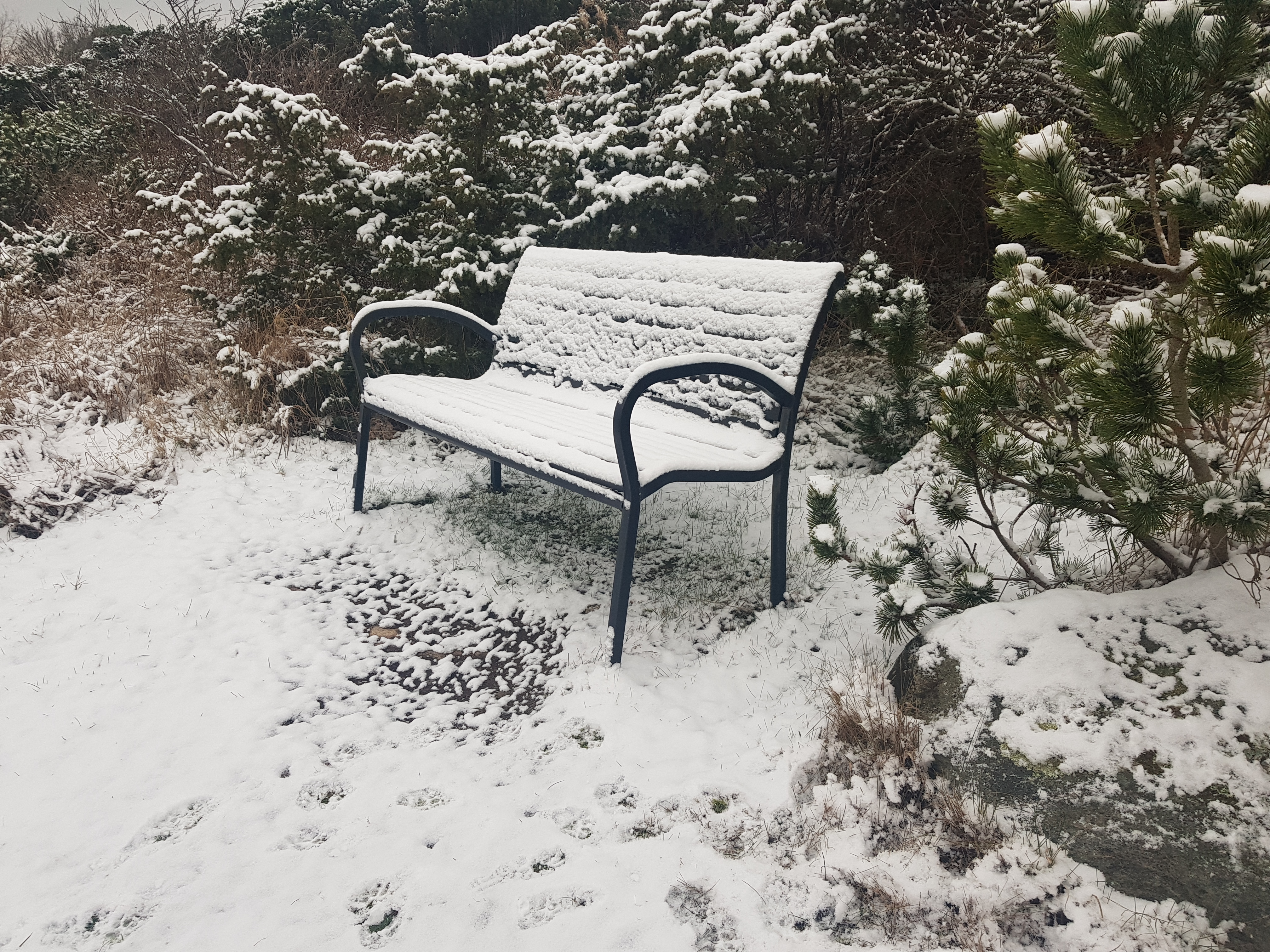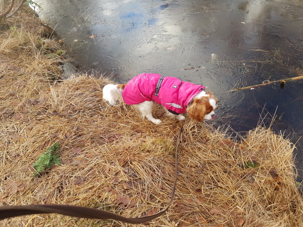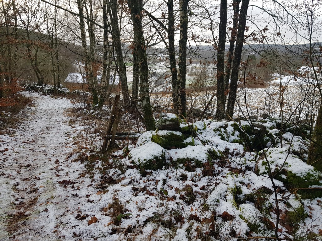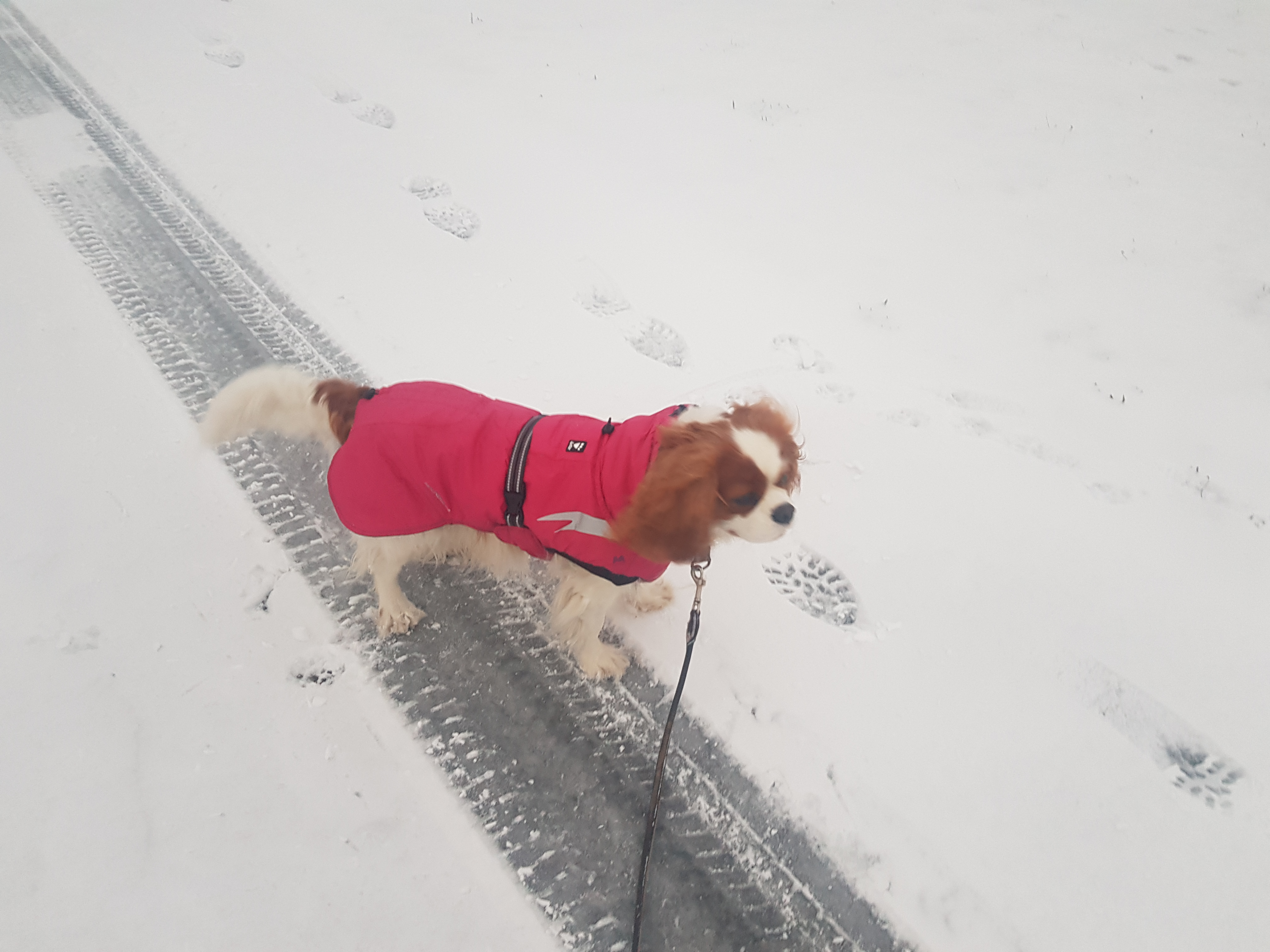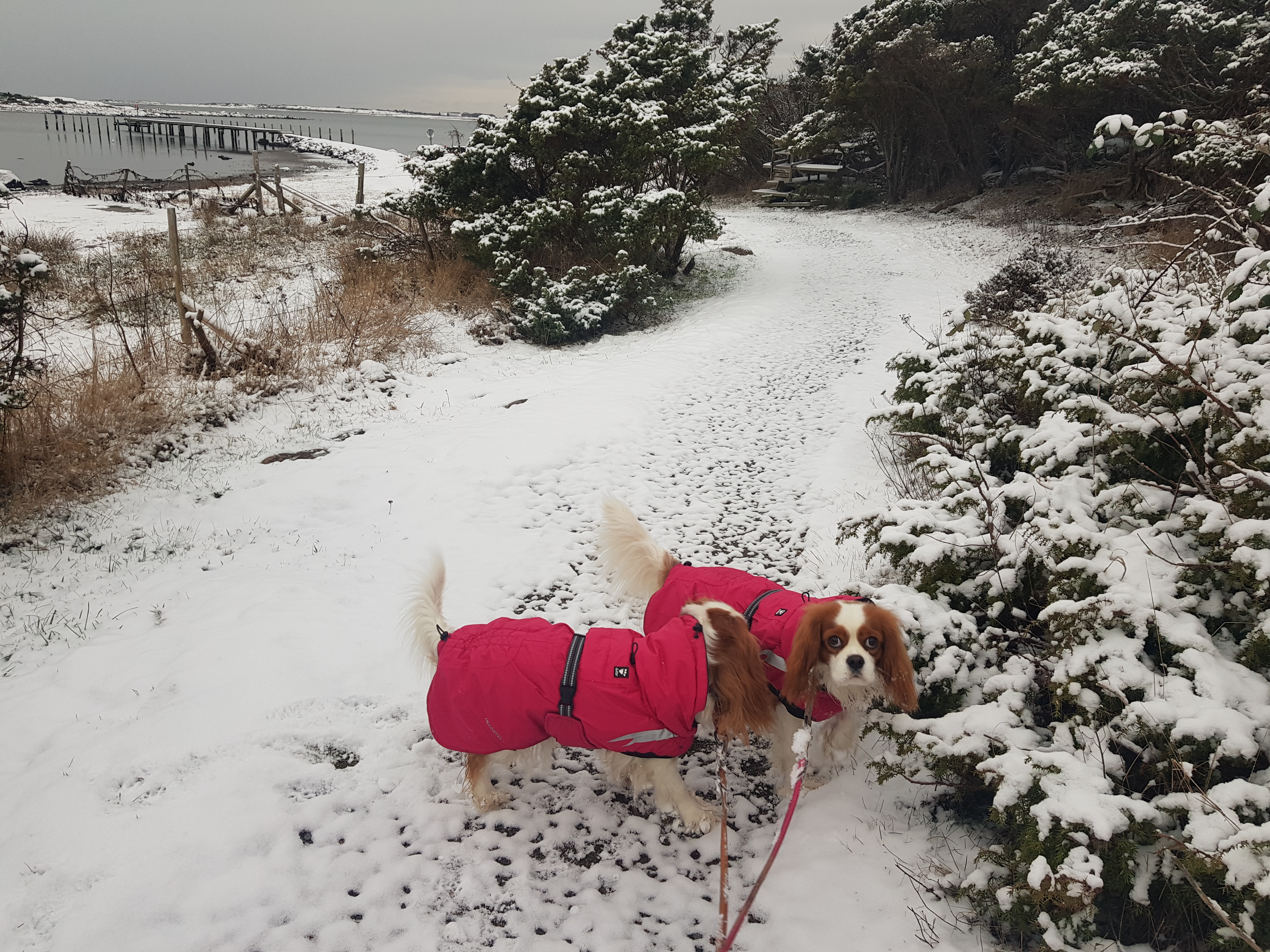 Började på Trettondagen, uruselt blåsigt och kallt OCH fint duggregn som övergick till att se ut som snö. Sen kom det till och med flingor. Så dagen efter är det snö på gräsmattorna och fruset lite isigt på vägarna. Samt det är kramsnö! Hundarna fick sina tassar fulla med snöbollar, vilket slutade med en liten varm dusch på tassarna när de kom hem.