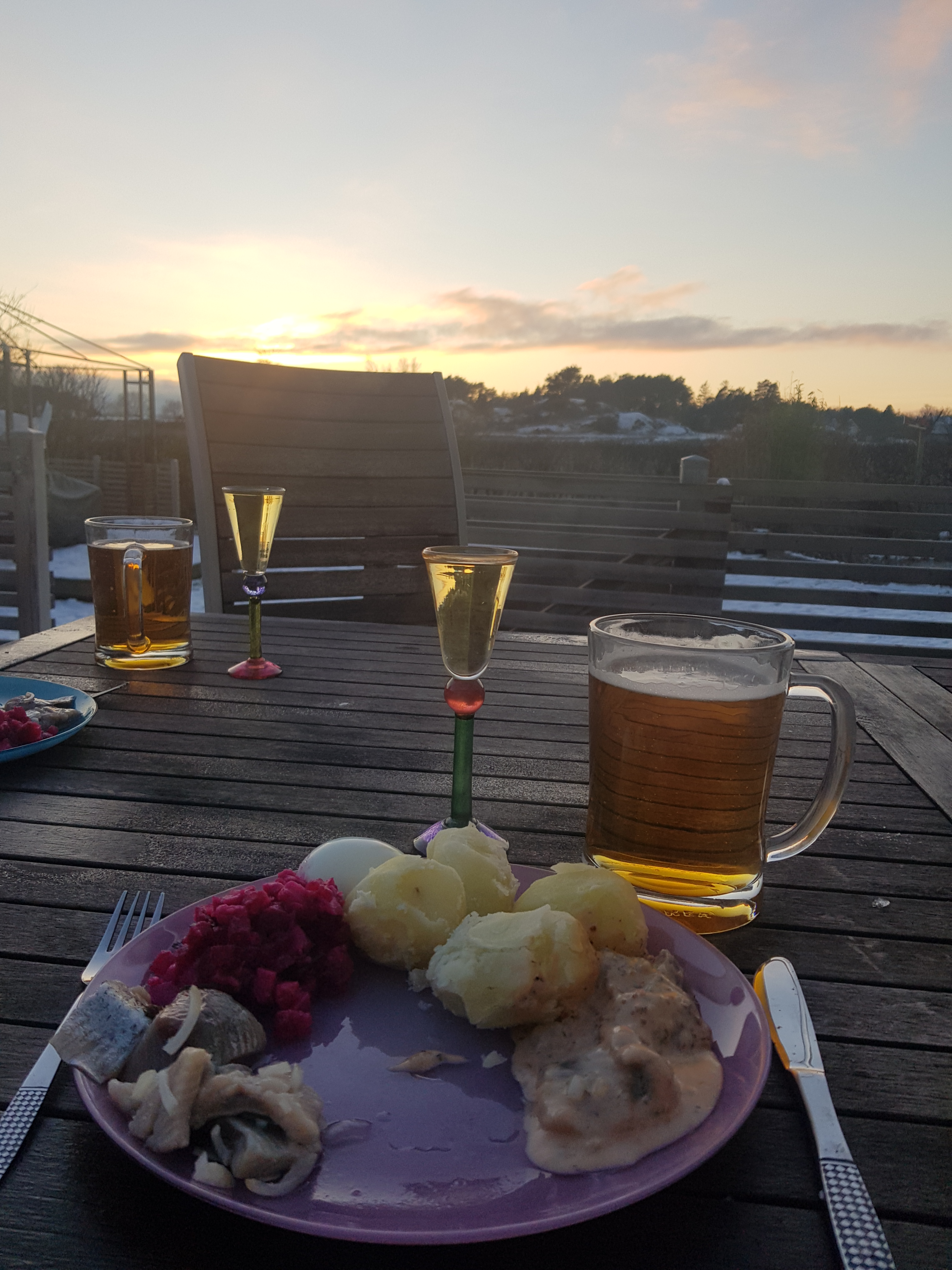 Juldagen var strålande sol, vi borde badat, men hann inte. Lite snö kom men blev snabbt slask. Såg på promenaden en dovhjort hoppa över gärdesgården. Senare tog vi sen lunch ute på altanen just innan solen gick ner. Avslutade dagen med ett parti 500.