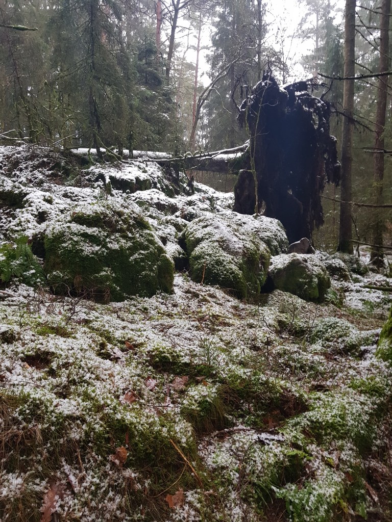 Helgen fortsatte med lite frusen snö, tillräckligt för att barnbarnen kunde åka pulka i backen. Jag själv tog en promenad med alla tre musketöserna, Stella, Stacy och Lisa i skogen. Hittade den största trävälta jag sett. Men snön försvann och vid promenaden i ”vår” skog var det bara grått och ingen snö, inte heller is på dammen.