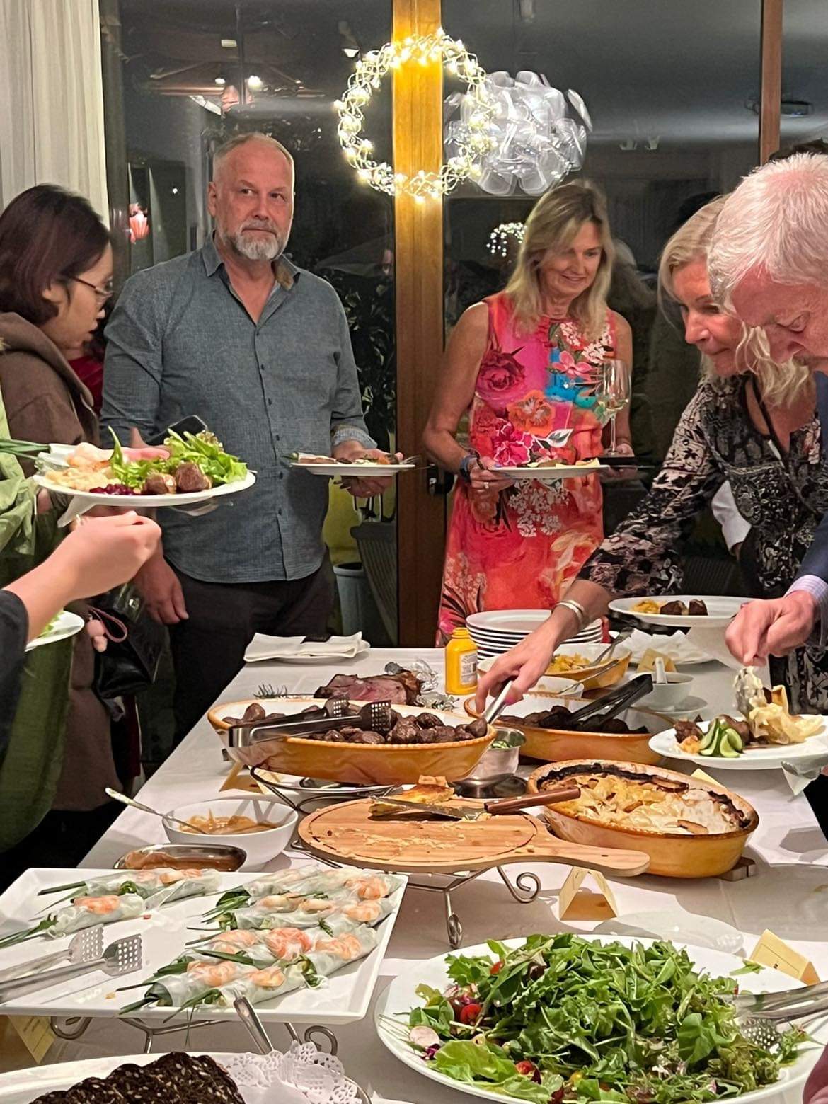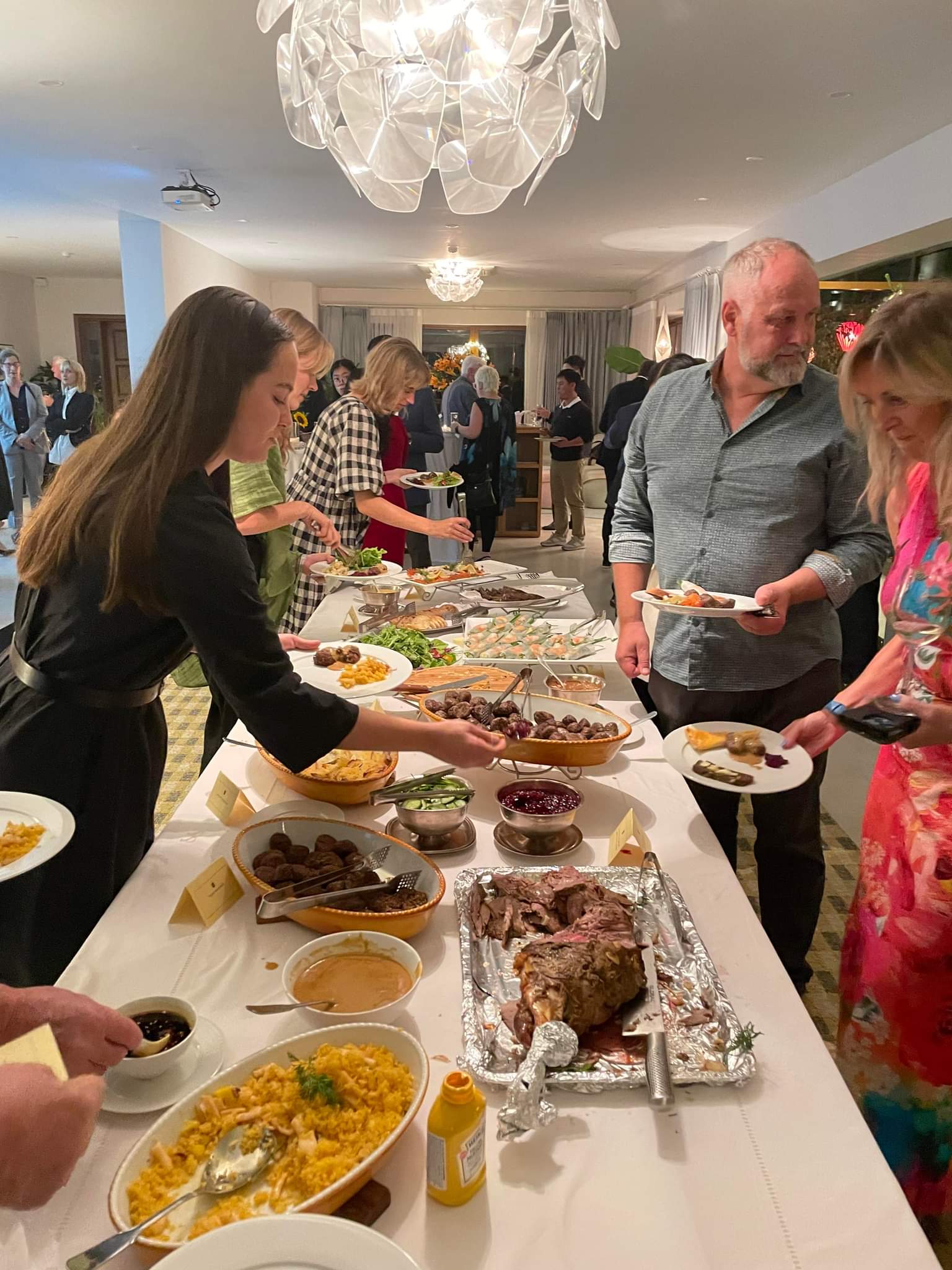 En höjdpunkt på vår resa, var att hela gruppen blev inbjudna av Ambassadör Ann Måwe till Svenska Ambassadens Residens i Hanoi. Utöver oss i gruppen var det ministrar från Vietnam, det var inbjuden personal från SIDA i Bangkok samt många Vietnamesiska chefer som var med och bygga upp pappersbruket redan på 70-talet.Vi var ca 30 personer där. Det var många fina tal, från vår sida var det min man Jan Högberg som höll ett fint tal. Därefter var det ett hederligt svenskt julbord, väldigt fint och intressant för de vietnameser som var där. Grönsakerna hade Jonas Sjöstedt odlat, Jansson frestelse hade Ann Måwe gjort.