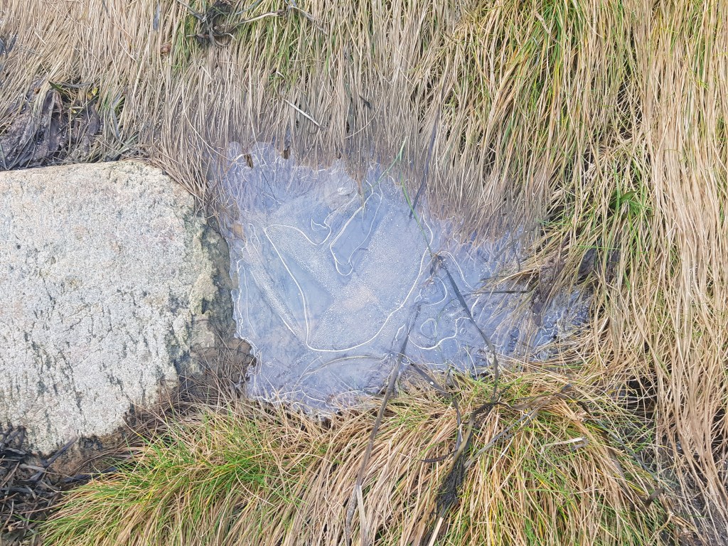 Jag följde med barnbarnen 6 och 7,5 år gamla för att åka skridskor för första gången. Tösen var överlycklig när hon häromdagen hade fått skridskor när hon kom hem från skolan. Lillebror hennes, var lite mer tveksam till detta med skridskor. Men, här finns en liten fin damm i skogen, som fryst så väldigt fint. Dit gick vi för att åka skridskor och för att grilla korv. Temperaturen var tidigt på morgonen över -11 gr, solsken men kall nordostlig vind (man upplever temperaturen som -17 gr) Vid lunchtid var det lite mindre vind så vi gick tappert upp genom skogen till dammen.