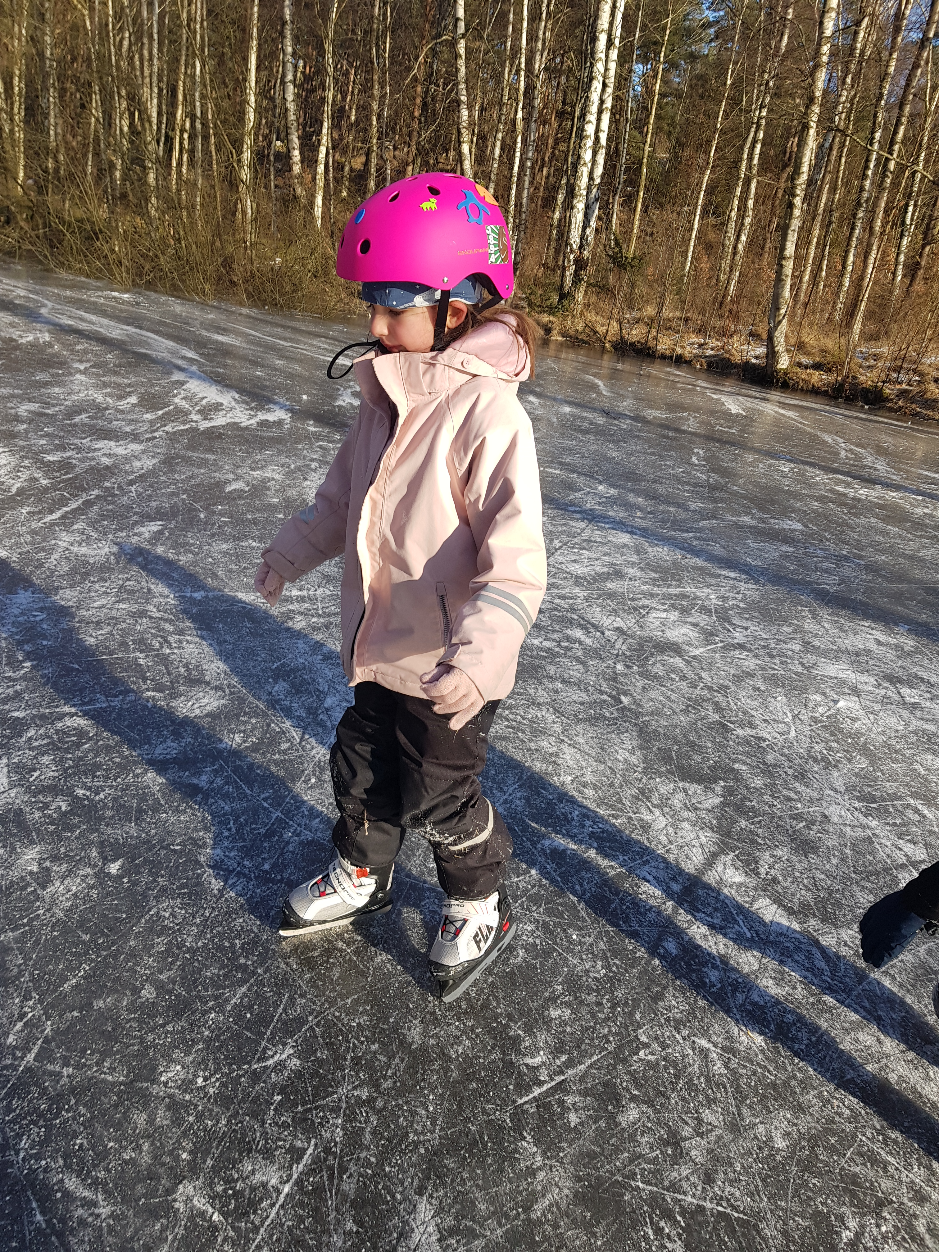 Barnen fick sina skridskor och vi stöttade dem lite för att de skulle få känna på hur det var att stå på skridskor. Det är minsann inte så lät i början med balans. Men tösen kom snart på det och gick på isen flera gånger. Bra balans kunde häva eventuell obalans och förhindra att ramla. Lillkillen var lite mer försiktig men kunde få balans ibland ändå.