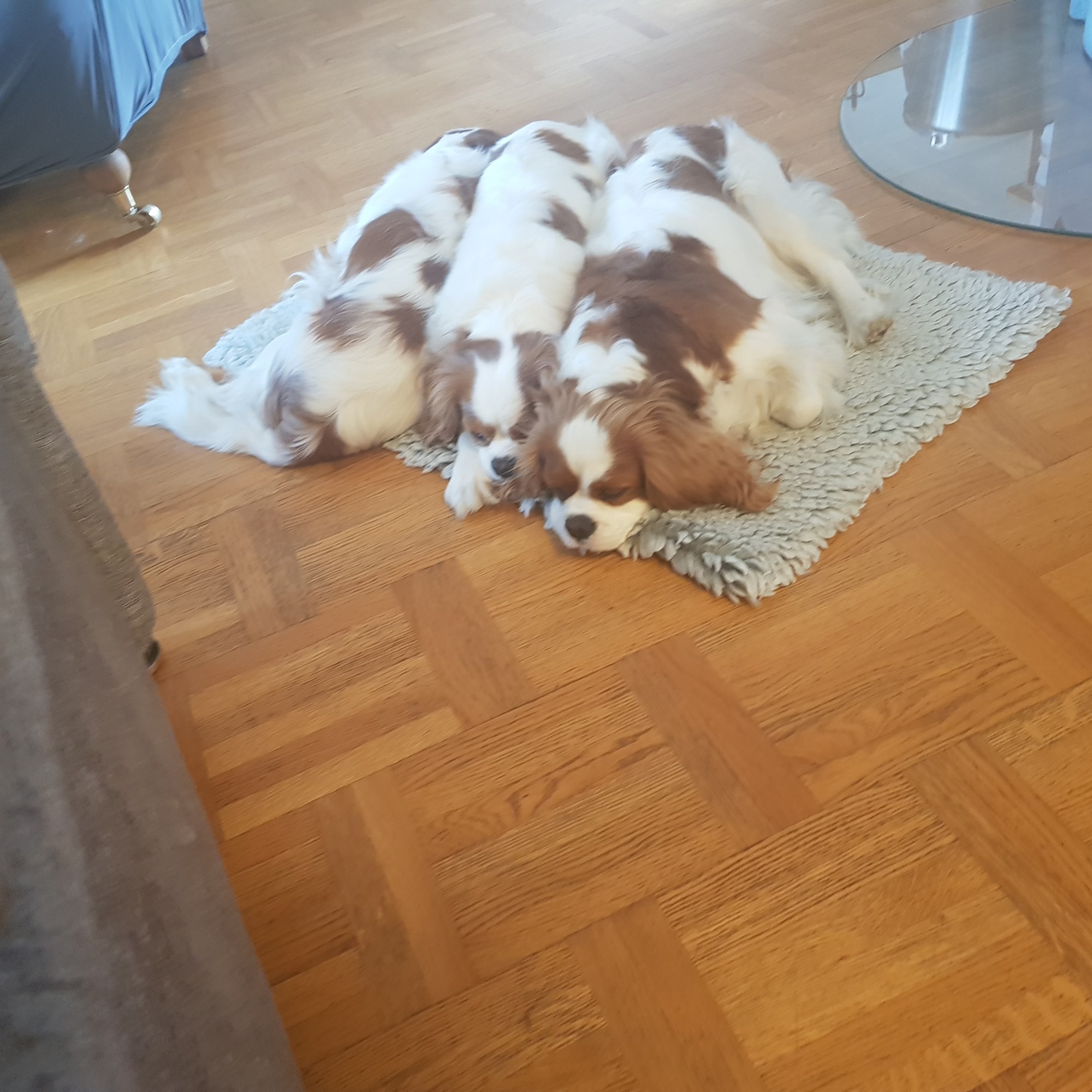 Ja det råkade jag ut för när jag akut fick besöka tandläkaren och var borta 1,5 tim. De brukar sköta sig, har TV rummet till sitt förfogande, lugnt och skönt. Jag kommer hem, möts av tre glada, hoppiga och skälliga hundar. Då jag upptäcker den gamla lilla trasmattan under bordet, till för att de inte skall halka när de hoppar ner från soffan.