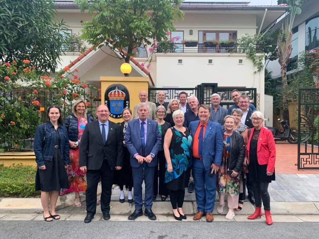 En höjdpunkt på vår resa, var att hela gruppen blev inbjudna av Ambassadör Ann Måwe till Svenska Ambassadens Residens i Hanoi. Utöver oss i gruppen var det ministrar från Vietnam, det var inbjuden personal från SIDA i Bangkok samt många Vietnamesiska chefer som var med och bygga upp pappersbruket redan på 70-talet.Vi var ca 30 personer där. Det var många fina tal, från vår sida var det min man Jan Högberg som höll ett fint tal. Därefter var det ett hederligt svenskt julbord, väldigt fint och intressant för de vietnameser som var där. Grönsakerna hade Jonas Sjöstedt odlat, Jansson frestelse hade Ann Måwe gjort.