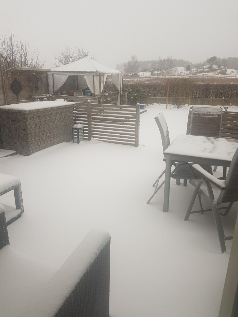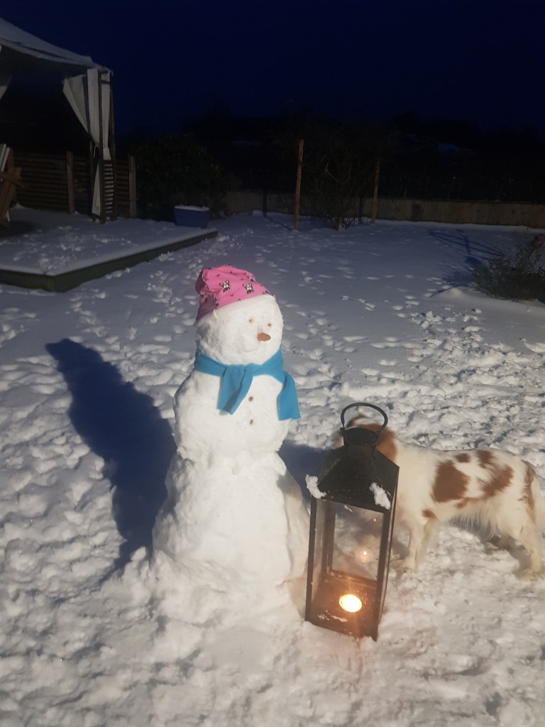 Så äntligen fick även vi lite snö, det snöade i går kväll, det har snöat lite hela dagen. Visserligen är temperaturen runt nollan nu. Men det finns snö. Man kan göra snögubbar och ljuslyktor. Tillsammans med hundarna var jag ute i trädgården en hel del idag. Jag gjorde till och med en snögubbe med morotsnäsa och mandelögon. HM, får se hur länge han får ha den näsan och när han välter för att det töar. Men kul var det med snö i alla fall och vacker solnedgång.