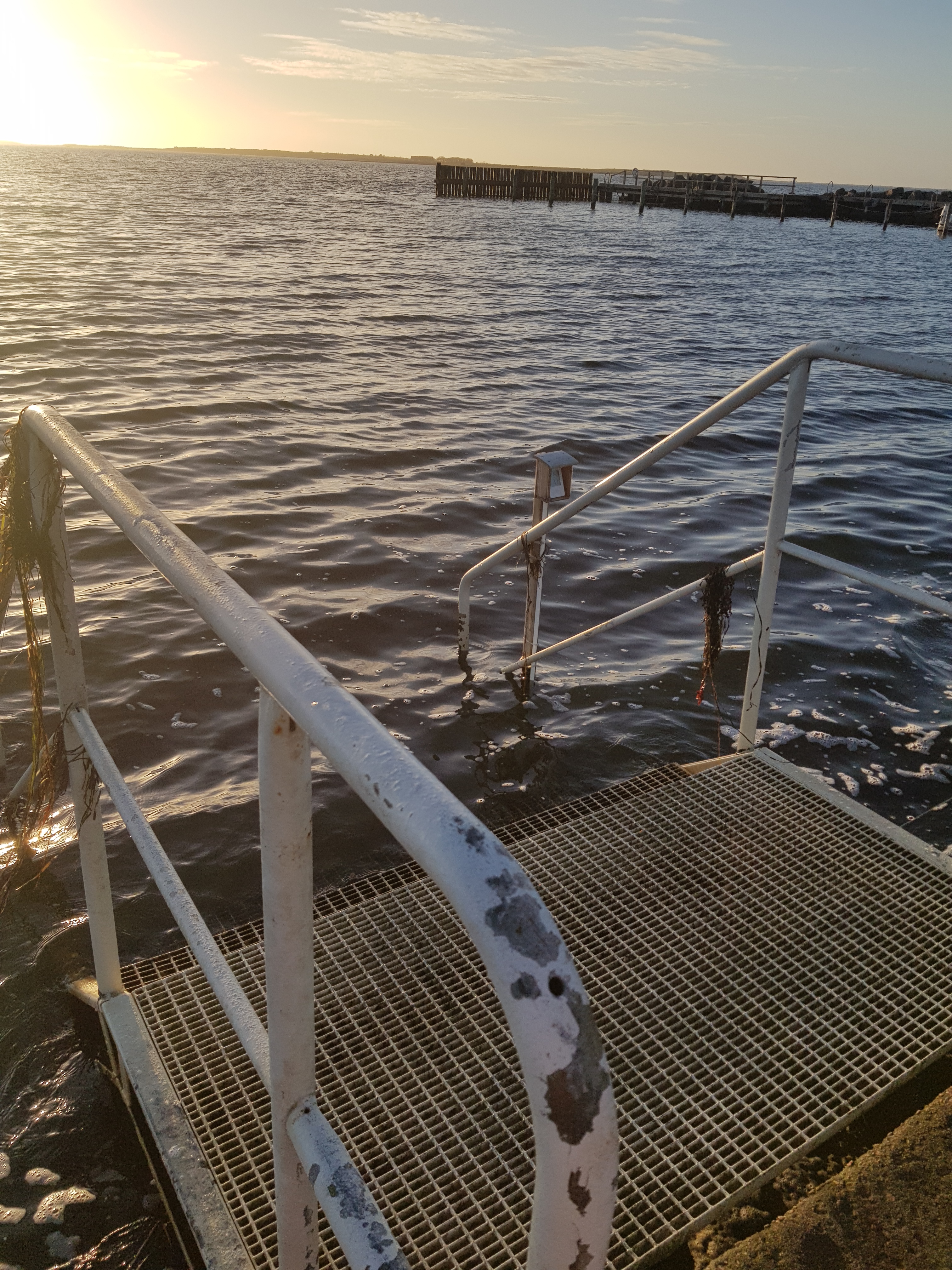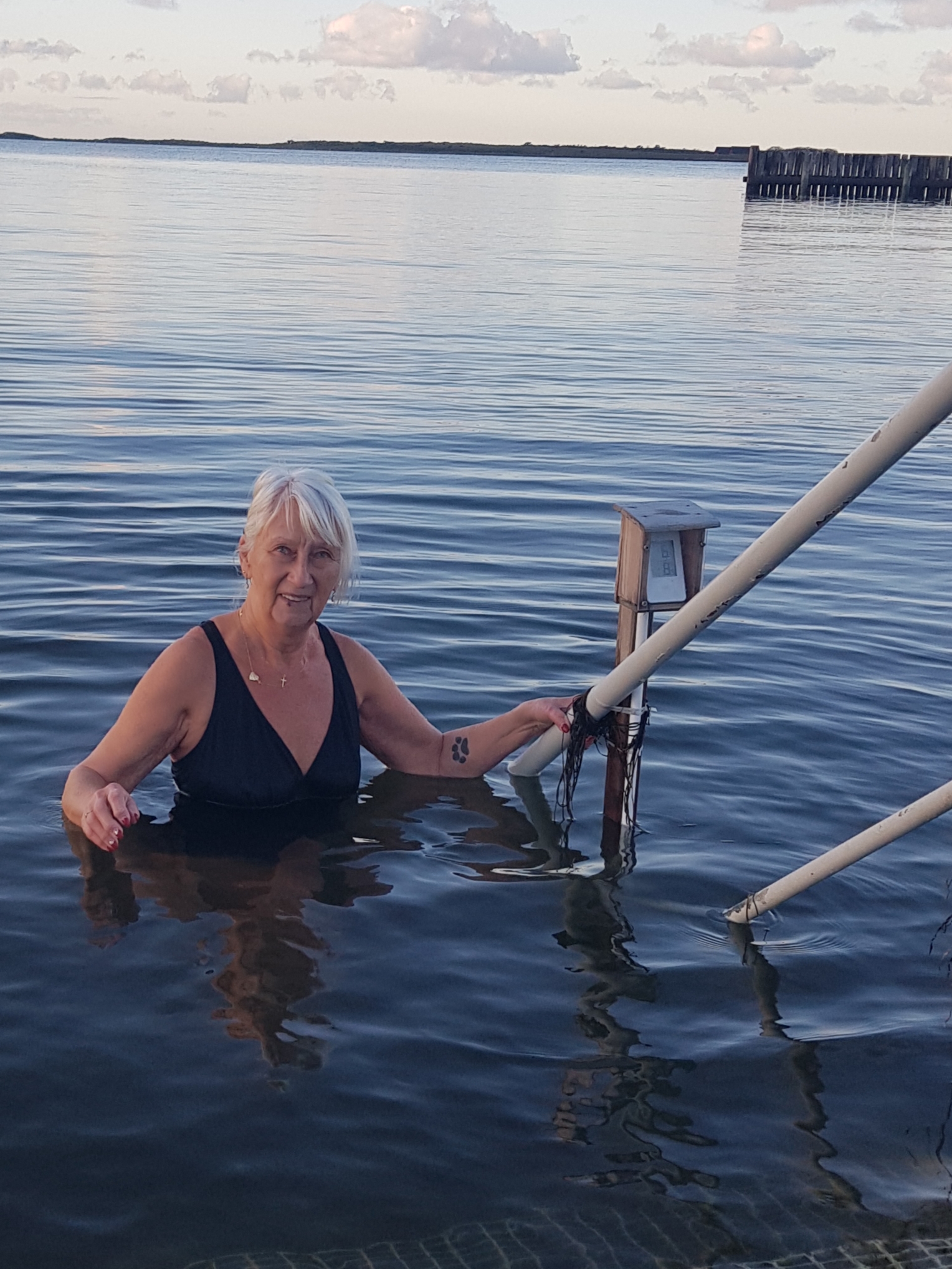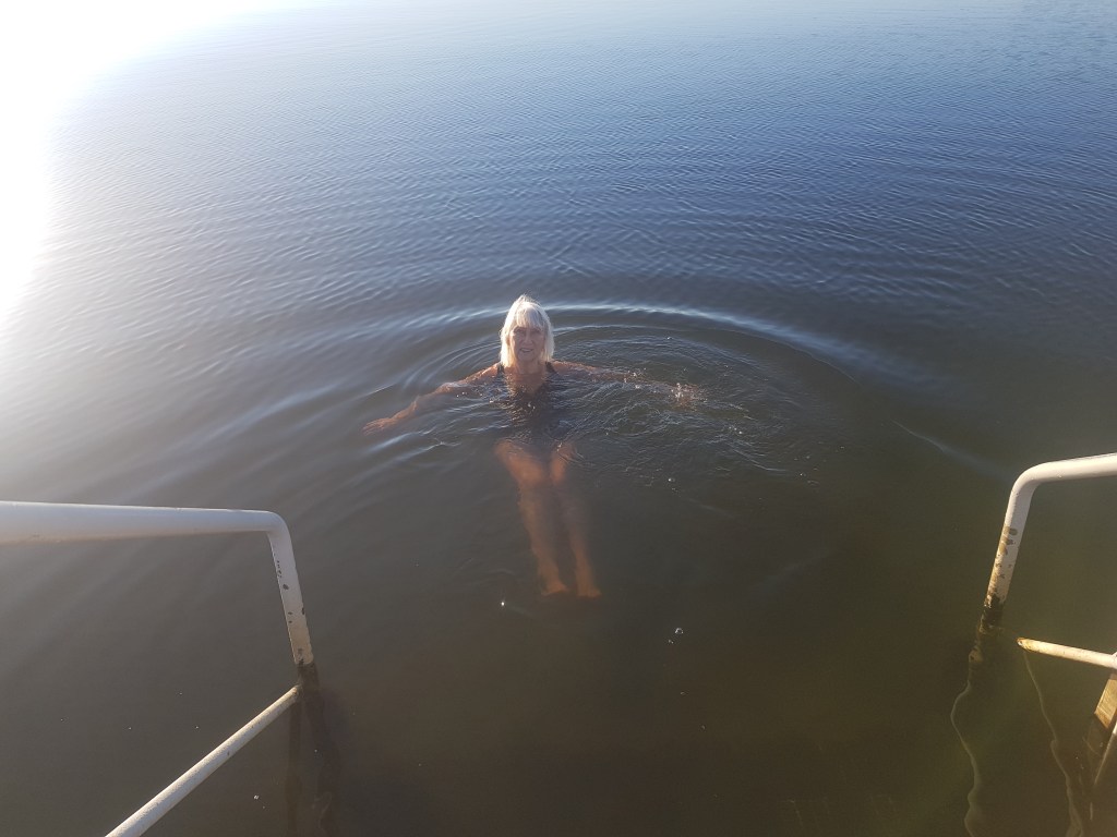 6 november, soligt och lagom vind. Vattnet känns skönt. Folk var ute och ”finpromenerade” iklädda varma jackor, mössor mm. Tittade på oss och sa: Ska ni bada? Ja, svarar vi. Ska ni verkligen bada? Japp! Så på bryggan står en liten publik på ca 10 pers, vuxna och barn. Avkopplade tar vi av oss badrockarna och går ner för trappan. Lägger oss ner i vattnet och simmar en bit ut i havet. Känns verkligen bra