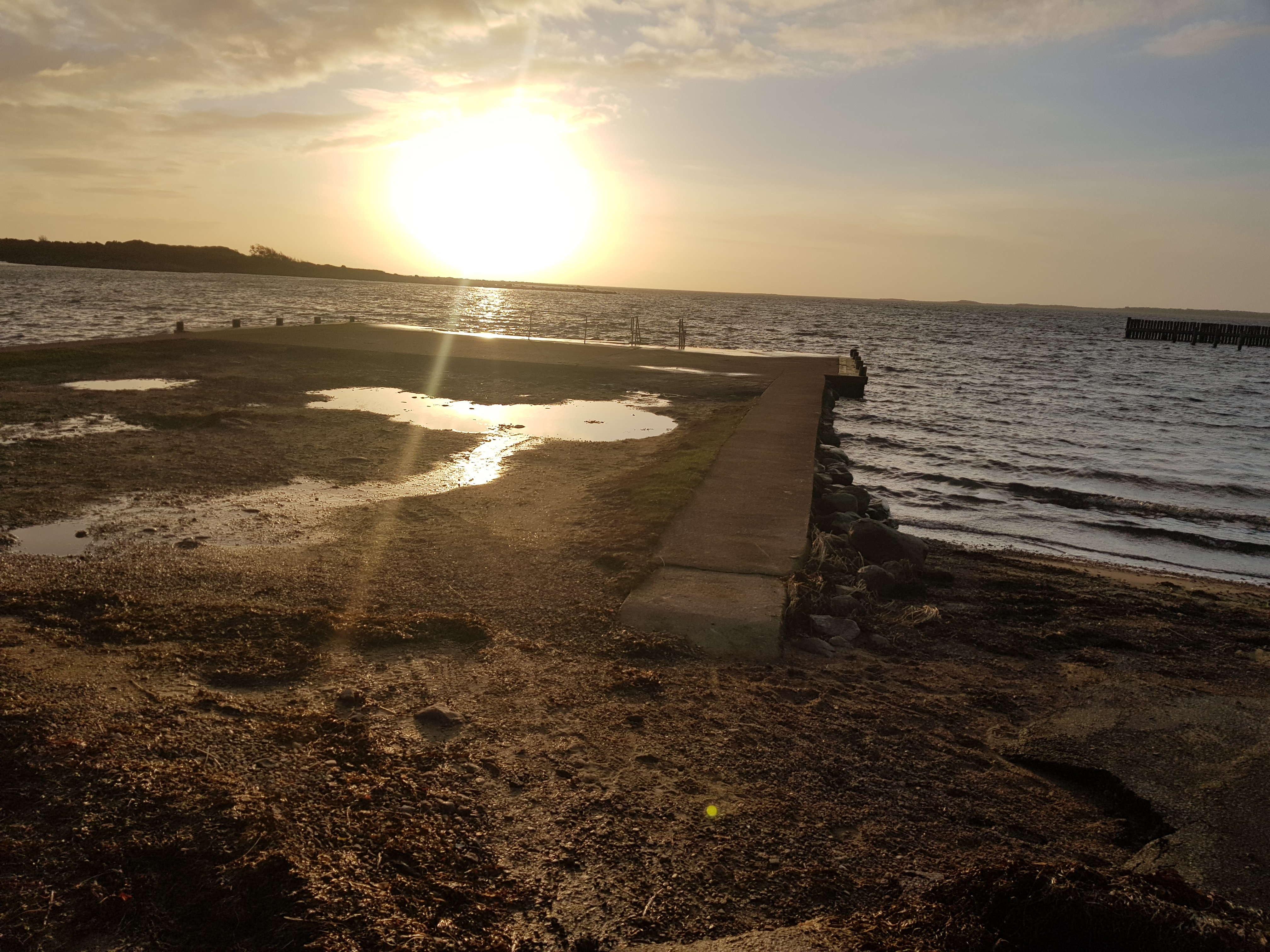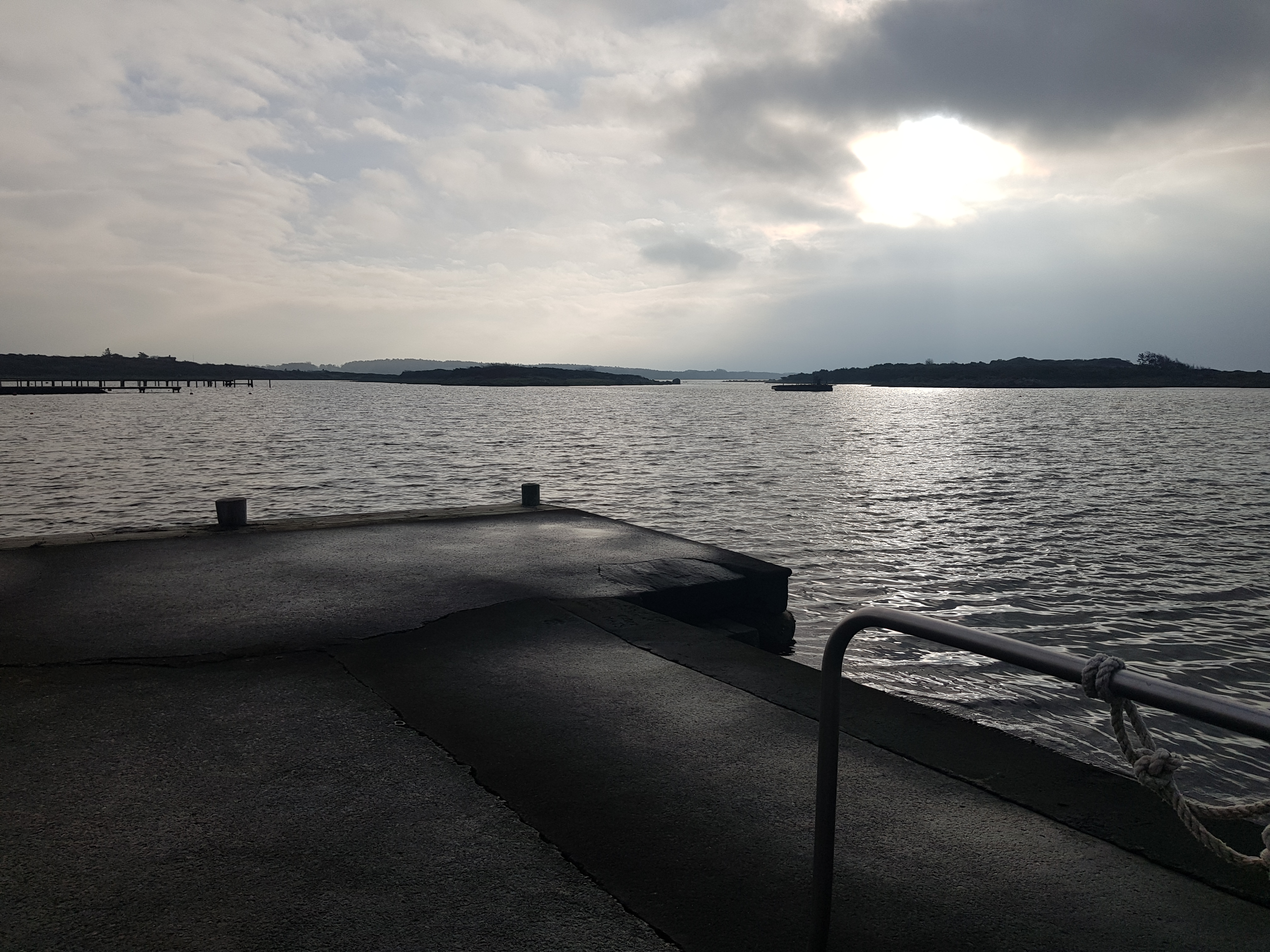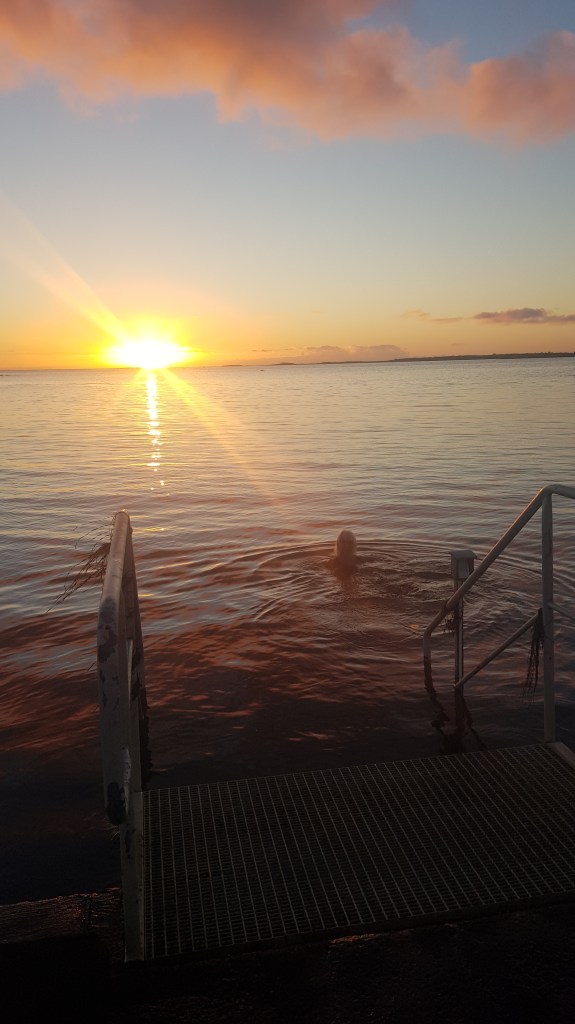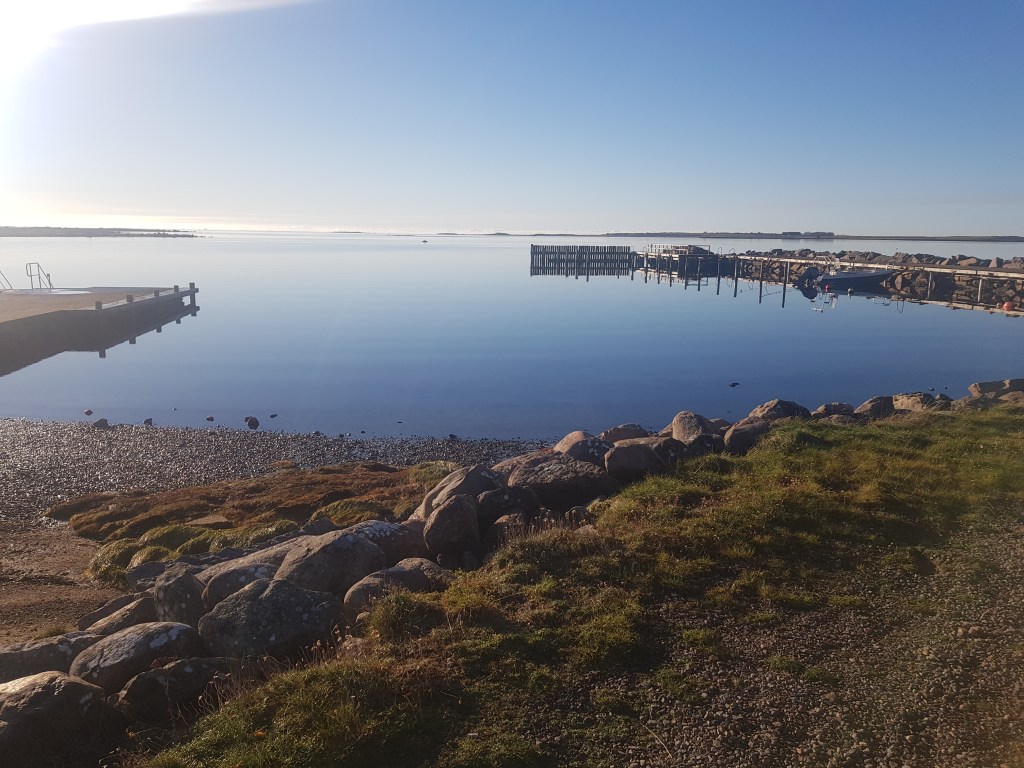 6 november, soligt och lagom vind. Vattnet känns skönt. Folk var ute och ”finpromenerade” iklädda varma jackor, mössor mm. Tittade på oss och sa: Ska ni bada? Ja, svarar vi. Ska ni verkligen bada? Japp! Så på bryggan står en liten publik på ca 10 pers, vuxna och barn. Avkopplade tar vi av oss badrockarna och går ner för trappan. Lägger oss ner i vattnet och simmar en bit ut i havet. Känns verkligen bra