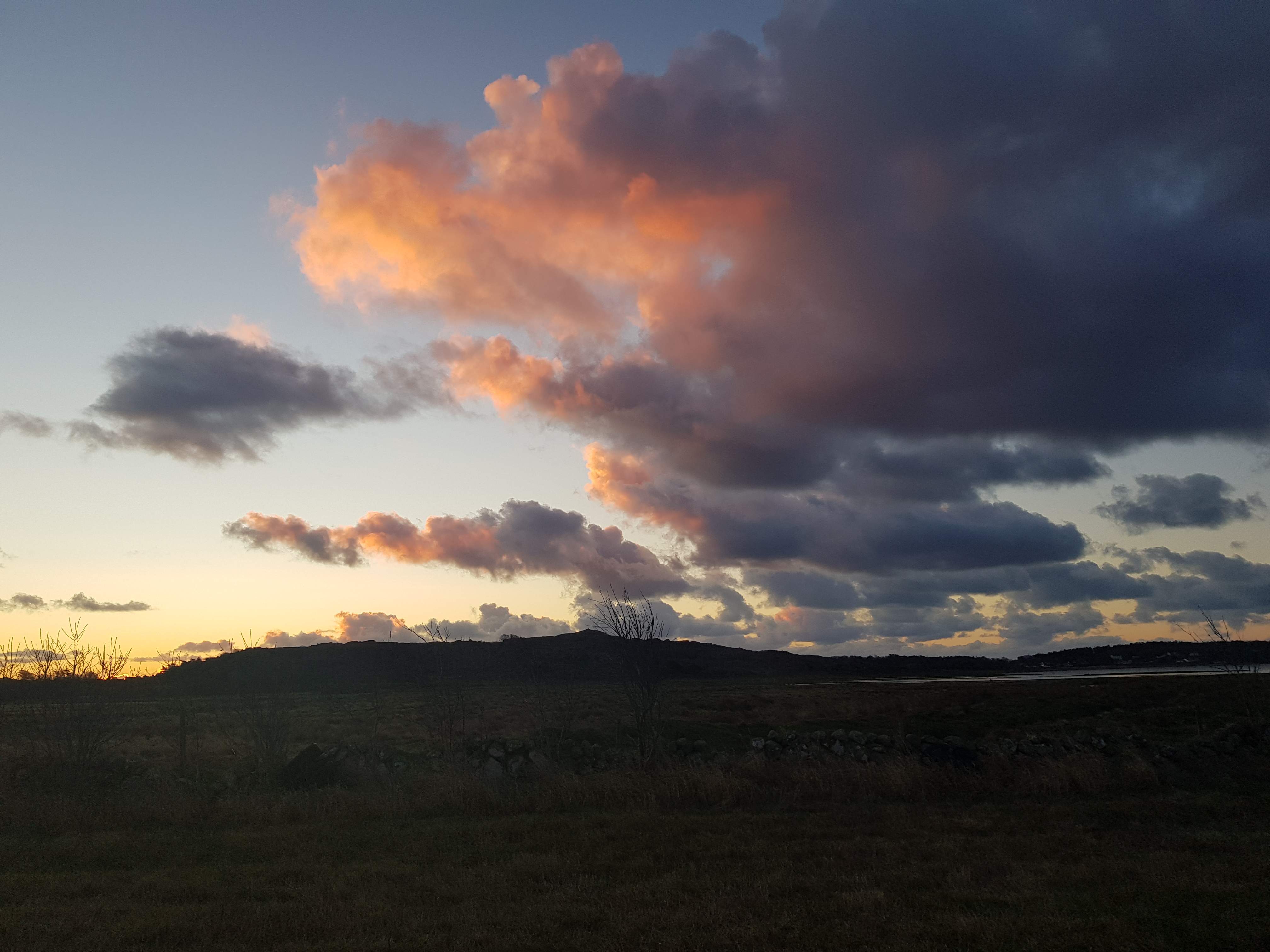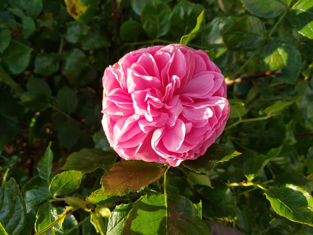 8 november, klockan 16 är det dags för bad igen. Solen har börjat gå ner och färgar himlen rosa. Det är ingen vind och det är ju skönt. Fortfarande rosor i trädgården