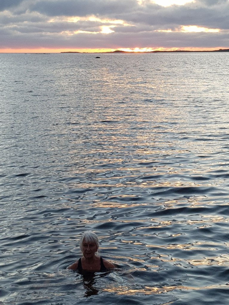 Trots det, blir det en hel del sköna bad med barnbarnen, lek i vattnet. Härligt ! Tanken på att bada varje morgon var en bra idé. Varje morgon, direkt när vi vaknat sticker vi till havet för att bada, simma en del. Då föds tanken på att VINTERBADA och där är vi nu på god väg.