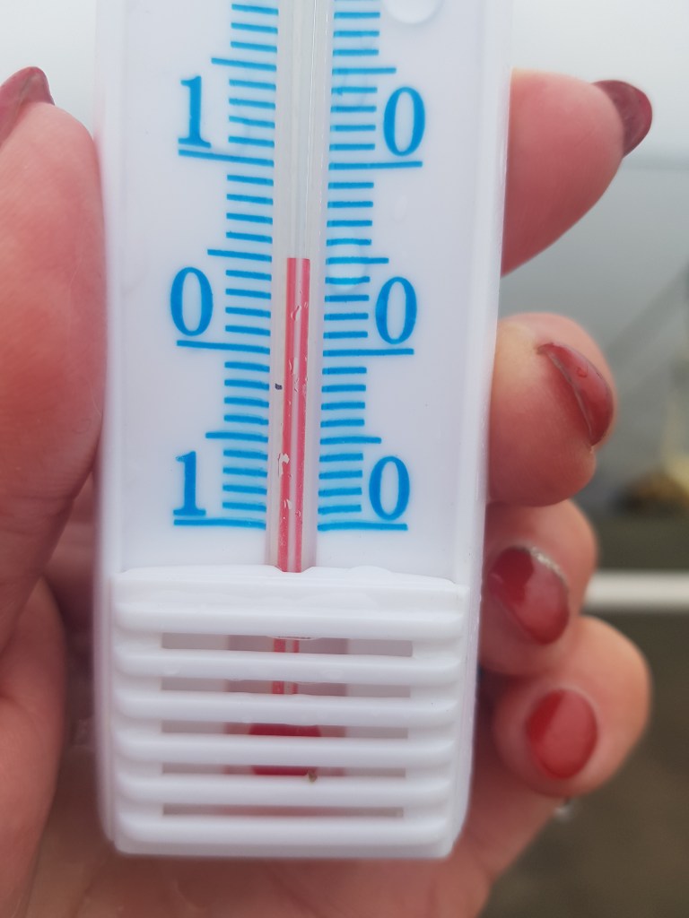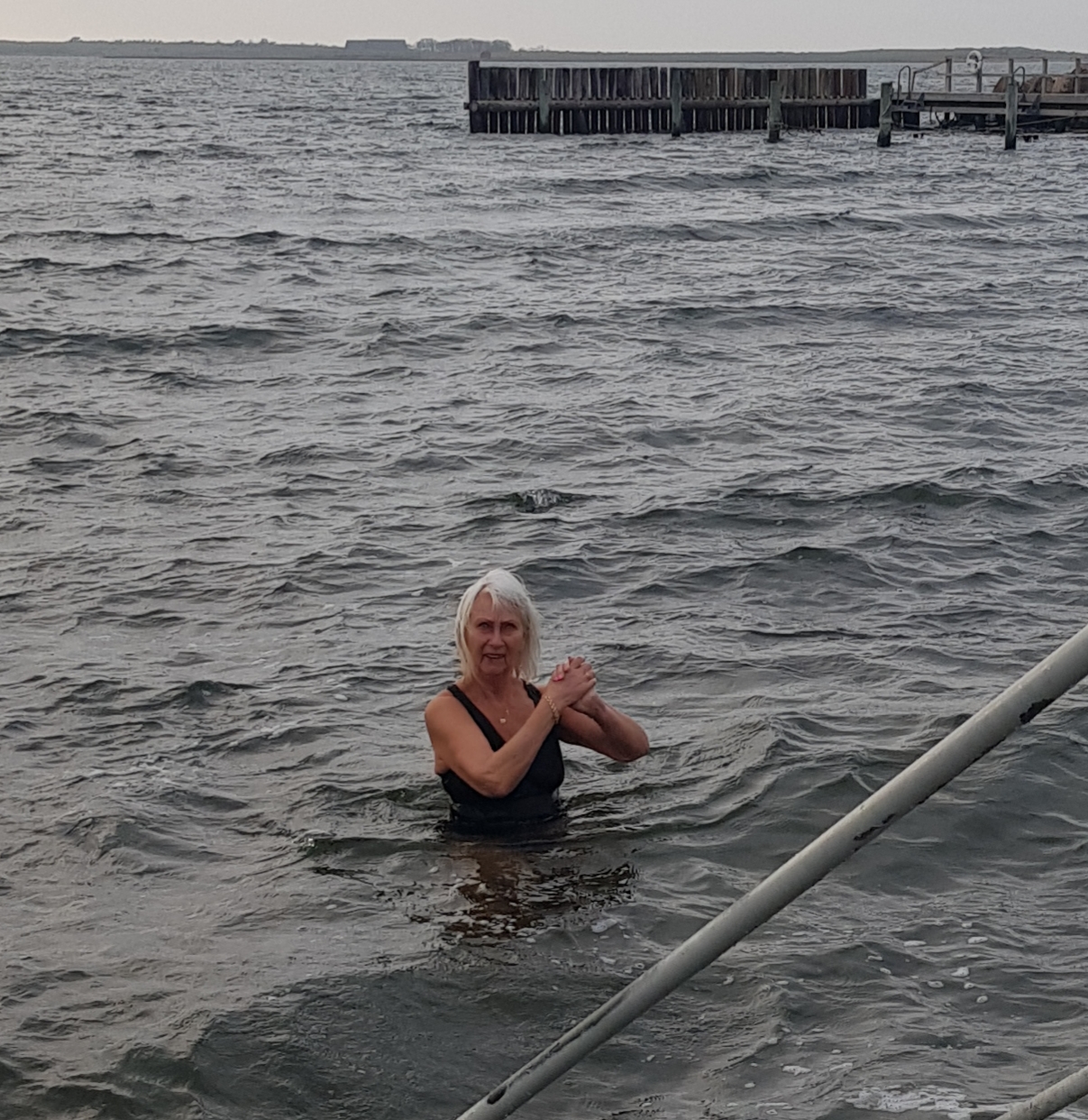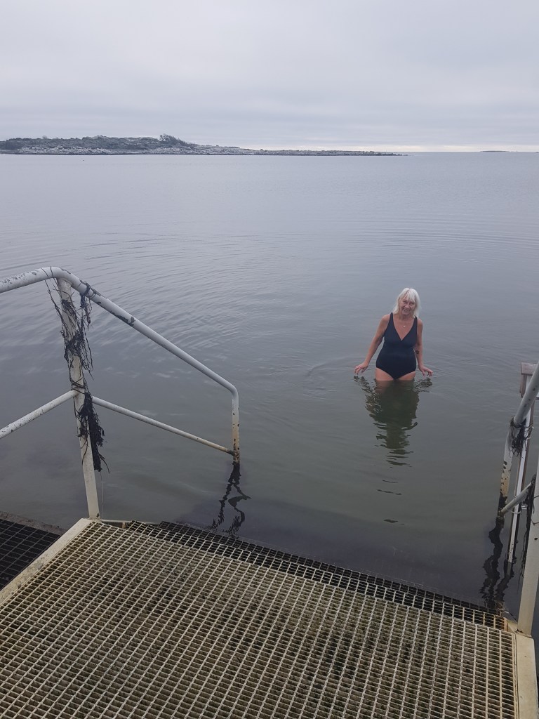 Temperaturen är: +11 grader i luften och +5 grader i havet. Kändes först kallt. Simmar en liten bit. Ställer mig upp vid trappan. Men, det var rätt skönt, går i igen och simmar lite till.