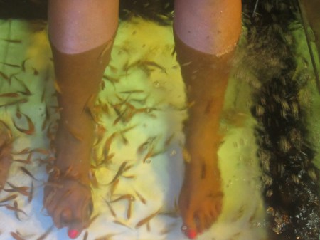 Nu var det gjort igen, denna gången förberedd sedan föregående år —– Det KITTLAS! Kittlas så man får bita ihop, knyta nävarna för att inte få hysteriska utbrott o hoppa ur fiskbadet. Efter en stund är det, just det SKÖNT! Man njuter! 150 Bath för 15 min. I 15 minuter simmar fiskarna runt mina ben och fötter, nafsar efter…. ja vadå egentligen!